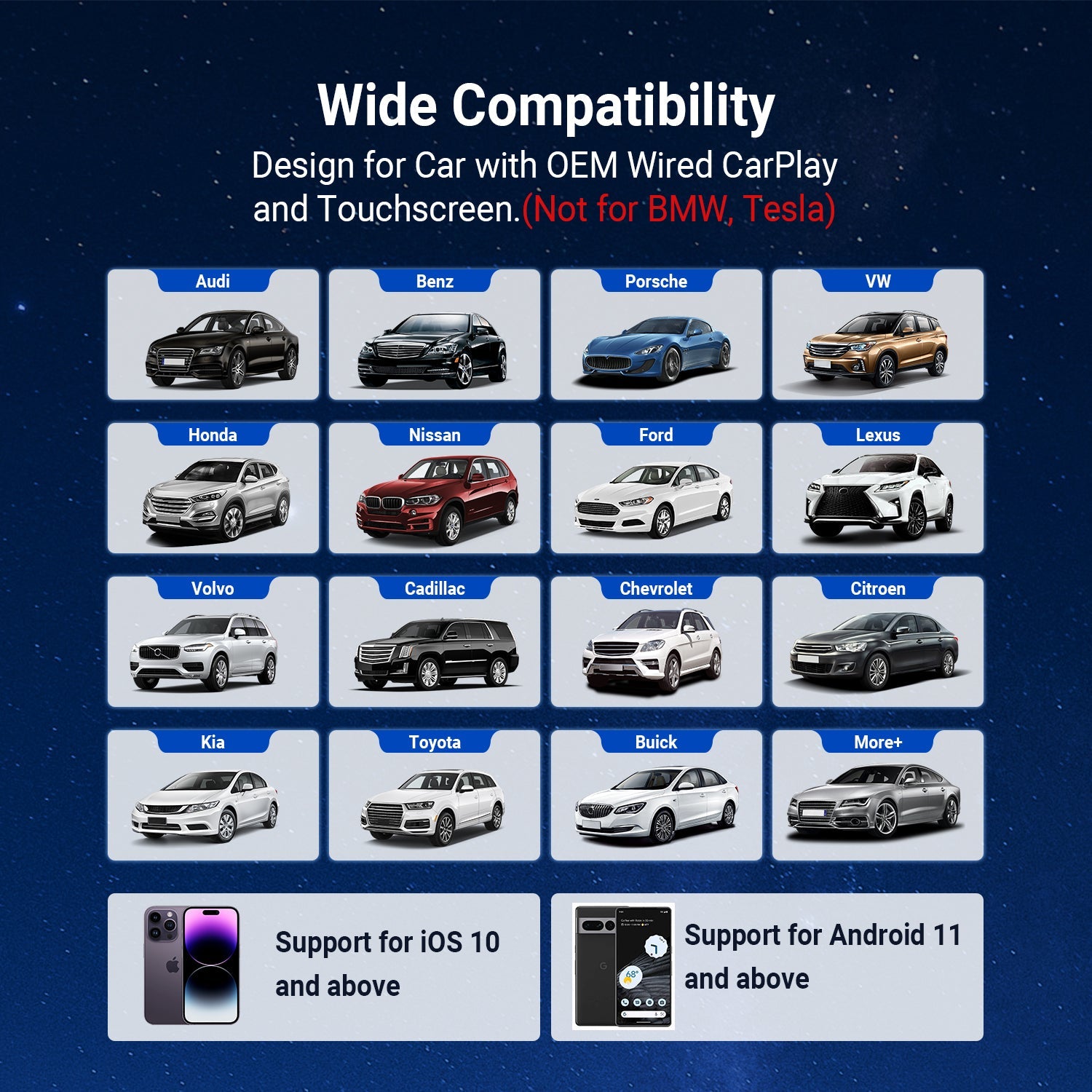 Designed for vehicles with factory wired CarPlay, this compact device lets you enjoy wireless connectivity and video streaming without modifying your car system.